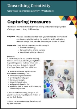 Gateway - Capturing treasures Unusual objects collected from your immediate environment can become starting points for creativity and imagination. A series of suggestions for creatively exploring your surroundings. Part of our Gateways into Creative Activity: a series of worksheets, videos and prompts for anyone who would like to have a go at a new artistic activity, or maybe rekindle a dormant creative interest, developed by Marion Cheung, Naz Syed, Creative Lives and Age Cymru, as part of the Unearthing Creativity project. Download worksheet (PDF) Listen to the audio description of this activity (5mins - MP3) Your browser does not support the audio element. Please click here to download the file We are extremely grateful to the Arts Council of Wales for their support for this project. Manage Cookie Preferences