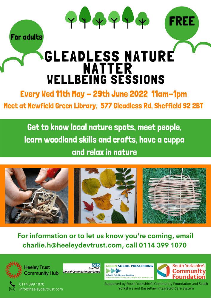 Resources Find a creative group Nature Natter Nature Natter is a great way to meet people, get to know your local green spaces and learn creative and woodland skills for anyone 19 years plus. We are a creative and nature based group all outdoors in the woods near Gleadless and Heeley Sheffield. We walk from the Library to the woods and learn woodland and creative skills outside. We learn about lighting fires/weaving/plant ID and also do mindful activities in nature. This group is about connecting to local nature spots in a creative and mindful way and meeting new people. We usually meet o Wednesdays between 11am - 1pm outside Newfield Green Library, 577 Gleadless Rd, Sheffield S2 2BT. We welcome everybody! No experience necessary. Are you interested in joining us? Please give Charlie a call at 0114 399 1070 for a chat about the group or more information. Alternatively you can contact us via email at [email protected]. Feel free to visit our website www.htcommunityhub.org and social media pages: Facebook Twitter Instagram YouTube Manage Cookie Preferences