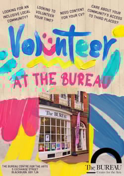 Opportunities Volunteering The Bureau Centre for the Arts seeks volunteers The Bureau Centre for the Arts in Blackburn exists because of the hard work of a group of local volunteers who took took on an abandoned building and created an art centre. As the Centre has continued to grow, volunteers still play a crucial role in different areas of the the organisation. You don't have to be an artist to volunteer, they need people to work in the cafe, steward at events, cover the reception and help out in many other ways. People volunteer for all sorts of reasons – to give back to the community, to develop skills or add to their CV, to build confidence or to be part of a community project. To find out more about volunteering, please call the Bureau on 01254 664215 or fill in this form. Manage Cookie Preferences