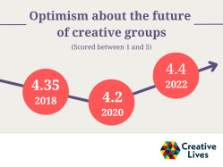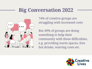 Policy & Research Research Big Conversation 2022 - Results Despite facing increased costs, many voluntary creative groups are finding new ways to support their communities. Creative Lives’ fourth large-scale survey of creative participation across the UK and Ireland found that: A majority of volunteer-led creative groups are struggling with increased costs, although around half are also doing something to help their communities with these difficulties, e.g. providing warm spaces, free hot drinks and waiving costs. Despite the increased cost of living and the lingering effects of the pandemic, optimism about the future of voluntary creative activity is now at the highest level since 2017. Creative Lives ran its fourth biennial Big Conversation survey in late 2022, seeking to undertake a detailed analysis of the voluntary-led creative groups which operate across the UK and Ireland. We wanted to compare the current attitudes to creative activity with those during the pandemic in 2020, and with the views from our pre-pandemic surveys in 2018 and 2017. In total, the survey attracted 450 responses from England, Northern Ireland, the Republic of Ireland, Scotland and Wales. 91% of respondents reported that they were currently involved in a creative group or a national network of creative groups, with a diverse range of artforms represented, from visual arts and crafts, through music, singing, drama and dance, to writing, photography and film. We’re incredibly grateful to everyone who submitted such thoughtful responses. The benefits of participating in creative activity As ever, the benefits of taking part in community creative groups were many and varied, but common responses included a feeling of connection with others in the community; maintaining or improving mental health and wellbeing; and learning or sharing skills. “It helps me in terms of emotional and physical wellbeing. Helps us all to form connections and friendships, to share our lived experience, and to learn new skills.” “I love being able to share my joy of crafting with other people and watch them flourish and grow in confidence.” “Having something to look forward to each week to get away from the stresses in life.” “Seeing people embrace their creativity in ways that aren't often enough encouraged by the mainstream.” The challenges facing voluntary creativity The biggest challenges facing creative groups were increased costs; funding; improving diversity of group/participants; recruitment of new members; and gaining support or recognition. “I love being back. It's so important to my sense of wellbeing and I missed it so much during the pandemic.” We asked if there was still reluctance of group members to come together following the Covid-19 pandemic, but 65% of respondents said ‘no’. In part, we believe this demonstrates a renewed enthusiasm for in-person activity, as some reported that group members had had enough of trying to meet and practise their creativity online. However, some people reported a continued uncertainty from some demographic groups, with respondents citing new mothers, older people and people with autism as being hesitant about returning to regular in-person activity. Spaces for creativity We know that voluntary creative groups meet in a variety of different venues across the public, private and voluntary sectors, and this year’s responses reflected this diversity, with activities taking place in libraries, community centres, church halls, village halls, shops, cafes and pubs; with a few groups meeting in their own homes or outdoors. Just under a fifth (18%) of groups still had an online element to their activities. Volunteers’ time Our survey found another increase in the number of hours that people contribute for free to creative groups. Of those that volunteer their time each week, the average number of hours was 9. This is an increase from 2020, where the average was 7.05 hours per week, which in turn was up from 6.3 hours per week in 2018. Coping with increased costs “We were providing a free space with refreshments, before 'warm spaces' were an actual thing. People can fetch a craft project or we will provide one, then people don't feel like they are just sitting in a space with no reason.” It is no surprise to find that, like the rest of society, creative groups were struggling with increased costs in fuel, food and other items. A majority (74%) reported that they’d experienced increased costs, with increases in costs for materials and equipment the most common response, followed closely by venue hire, utilities and insurance. We wanted to ascertain what measures groups were taking to deal with these increased costs, and if they were able to offer any support to those who might be struggling in their neighbourhoods. Unsurprisingly, finding appropriate and affordable venues is an increasing challenge, and some groups have found that they have had to increase their subscriptions, although many groups feel that they’re unable to charge their members any more. Some groups are having to come up with new ways to raise funds, such as seeking new sponsorships or donations; holding paid exhibitions or online art sales; or selling second hand items on eBay. Some groups highlighted how small amounts of funding can make a huge difference for their continuation, once again demonstrating the vital importance of micro-grant schemes. “Creative Lives have funded our group with a micro-grant which pays for a shared lunch each week.” We knew from the pandemic that because of their deep connections in communities, some creative groups mobilised to assist people who were isolating, by providing remote activities, supplying art and craft packs, etc. We wanted to see if a similar response was possible in the context of increased costs of living. Nearly half (49%) of groups are doing something to help their community with these difficulties. Many groups were providing warm spaces 