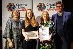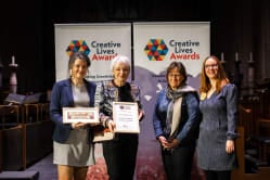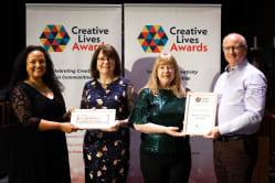 Creative Lives Awards 2021 Winners Run by Creative Lives, the Creative Lives Awards are open to any amateur group or project based in the UK and Ireland. In 2021/22 we celebrated resilience and imagination during the Covid-19 pandemic, shortlisting a fantastic 31 groups that carried on being creative despite the challenges they faced. Meet the 12 wonderful winners who attended our ceremony at Coventry Cathedral on 1 March 2022. ENGLAND WINNER May Project Gardens - a South London-based grassroots organisation whose mission is to empower marginalised groups to address poverty and access to resources, and to exert influence through sustainability and creativity. Ian Solomon-Kawall from May Project Gardens, England Winners, said: We are proud of the work that May Project Gardens did during the pandemic by continuing to provide a safe space for our Hip-Hop Garden participants. This included using Hip-Hop to help them express their feelings about lockdown, maintaining their wellbeing by keeping fit with outdoors training using music, alongside building a natural straw bale classroom that has slowly been turned into a music studio. IRELAND WINNER Black Box Projects - a Belfast-based community run for and by people living with learning disabilities, supported by a team of dedicated volunteers from within the Black Box venue in Belfast. Shifting to online delivery, the group stayed connected through a diverse programme including a book club, discussion group and music sessions. Seonaid Murray from Black Box Projects, Ireland Winners, said: We are really proud of our Black Box Projects Volunteer Team for bringing so much enthusiasm, creativity and support to our projects and activities. Our group members were socially isolated before the pandemic so it was really essential to keep connected and sustain a regular routine for our group while many services had stopped. We are delighted for the recognition from the Creative Lives Awards! SCOTLAND WINNER Overdrive Dance Company - a group that promotes dance for boys and young men living in Glasgow. Each person harnessed their skills to shift work online; showcasing creativity and resilience throughout. They reworked their upcoming stage performance 3billion to be presented on screen instead. Hayley Earlam from Overdrive Dance Company, Scotland Winners, said: I’m so proud of the young people of Overdrive Dance Company. During the pandemic, we delivered online Zoom sessions to keep the young people connected and to continue having dance in our lives. Over this time, they went above and beyond to keep being creative and they supported each other through tough times. I couldn’t be more proud of their commitment, resilience and creativity. WALES WINNER Cricieth Creadigol / Creative Criccieth - a small, bilingual, seaside town on the coast of north-west Wales. In response to the pandemic, the community was encouraged to get creative through a series of imaginative voluntary-led projects. Catrin Jones from Creative Criccieth, Wales Winners, said: I am so proud that we responded to the challenges imposed by Covid-19 with compassion, energy and vision. We reached out, through varied creative projects to involve hundreds in the community, drawing on talents from across the generations and from all the districts of the town, contributing to people’s well-being and quality of life. The response from individuals and community groups to our varied imaginative projects have been fantastic. PEOPLE’S CHOICE AWARD WINNER (chosen by the public in an online vote) Drumgoon Hill Old Graveyard Committee - a group who presented Hooley in the House, as part of the national Culture Night festivities in County Cavan. Recording footage that combined music, singing and storytelling, the event was shared online for the whole community to engage with and enjoy. Gemma Kettle of Drumgoon Hill Old Graveyard, Ireland Runner-up, said: We're proud of the work that the Drumgoon Hill Old Graveyard team does, because of the many fantastic people it involves. Over the pandemic we delivered the online event Hooley in the House and this helped to safely showcase the wonderful talent and creativity of the Cavan area while overcoming the restrictions which impacted on the local community. We feel honoured, happy and humbled to be recognised. PEER AWARD FOR EXCELLENCE (chosen by the shortlisted groups) May Project Gardens was awarded its second accolade of the evening, alongside co-winner Celf-Able - an inclusive, disabled-led art group from Wales that moved its weekly sessions online, to continue advocating for accessibility across arts. Sue Patch from Celf-Able, recipients of the Peer Award for Excellence, said: We are so proud and delighted that the work Celf-Able has been doing over lockdown has been recognised and appreciated. We were fortunate to get enough funding to allow us to send out art packages to our members and a Zoom subscription so we could all meet up virtually. We now meet face to face and continue with ‘zoom in the room’ for those unable to attend. We know from our members how much they appreciate our service - albeit in a different form - and will continue to keep going in whatever media we can! LOCAL HERO AWARD With the awards taking place in Coventry as part of the UK City of Culture, the Local Hero Award was awarded to Mark Gibbins of Coventry Men’s Shed. Mark been running this group for eight years, with little funding and by giving up huge amounts of his free time to support men who are vulnerable and at risk of suicide. CELEBRATING DIVERSITY AWARD WINNER Coffee ’n’ Laughs - a friendship group for women “of all faiths and none” in the ethnically diverse area of Maindee, Newport in South Wales. Sue Lewis from Coffee ’n’ Laughs, Winners of the Celebrating Diversity Award, said: Coffee ’n’ Laughs is a great gang, and we couldn't have spent lockdown with a better set of friends. We natter, knit and stitch, and didn't miss a beat when we were sudd