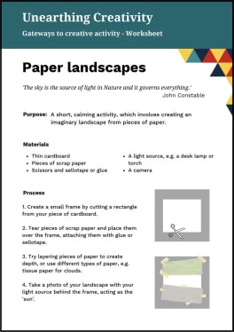 Gateway - Paper landscapes A short, calming activity that involves creating a landscape from pieces of scrap paper, then adding a light source. Part of our Gateways into Creative Activity: a series of worksheets, videos and prompts for anyone who would like to have a go at a new artistic activity, or maybe rekindle a dormant creative interest, developed by Marion Cheung, Naz Syed, Creative Lives and Age Cymru, as part of the Unearthing Creativity project. Download worksheet (PDF) "This was a very interesting activity, with unexpected results." "It was interesting how the angle and distance of the light totally changed the effect. Very satisfying task. It’s weird to think that these pictures only existed temporarily." "A really interesting idea and exciting to see what emerged as more bits of paper were added." We are extremely grateful to the Arts Council of Wales for their support for this project. Manage Cookie Preferences