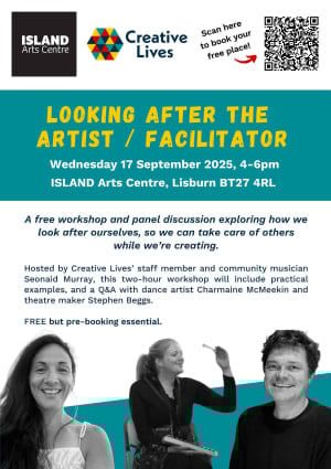 Opportunities Events Looking After the Artist / Facilitator A workshop and panel discussion exploring how we look after ourselves, so we can take care of others while we’re creating. Hosted by Creative Lives’ staff member and community musician, Seonaid Murray this two-hour workshop will include practical examples, and a Q&A with dance artist Charmaine McMeekin and theatre maker Stephen Beggs. Free, but pre-booking is essential. Book Manage Cookie Preferences