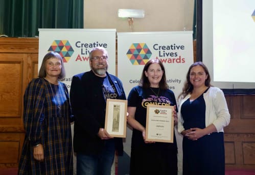 Current work Creative Lives Awards OH!CON * Creative Lives Awards 2024 - Scotland Winner * OH!CON first took place in 2022 as a small library event in the Isle of Lewis in the Outer Hebrides. But the comic con was so popular, a group of volunteers got together to make it an annual event. A year later, OH!CON 2023 attracted almost 500 people enjoying a programme of activities inspired by comics, art, science fiction, fantasy, film, animation, gaming, design, prop making, cosplay and other creative pursuits. Islanders have limited access to cultural events, due to the distance, time and cost of travelling to the mainland. So volunteers brought guest writers to the event, as well as offering drop-in sessions on LEGO-building, animation, art and cosplay competitions, and a range of activities such as mask-making and 3D-printing. A highlight of the day was the ‘Cosplay Masquerades’, during which those who had come in costume, walked around the venue and winners received a prize. Costumes were almost all home-made from preloved clothing or recycled materials. “OH!CON started out as a way to bring like-minded people together, but we were bowled over at the reception the con received,” says Kathleen Milne. “In a very traditional area where comic cons are not the norm, the event seemed to inspire people from all different backgrounds to attend. The event transcended so many barriers, and people came together regardless of culture, gender, age or neurotype. “The best thing about OH!CON was seeing young people unafraid to attend in costume, and feeling welcomed and safe. There tends to be a lot of bullying at schools in the isles, and in an area with a small population, it’s hard to be different, to be ‘yourself’. We truly believe that our event provides people with the space and confidence to be themselves and embrace their individuality through creativity.” You can find out more via their website or follow them on Facebook, X/Twitter, Instagram and YouTube. [Pictured: Jill Miller, Creative Lives; Hereward Proops & Kathleen Milne, OH!CON; Esme Leitch, Creative Scotland] Manage Cookie Preferences